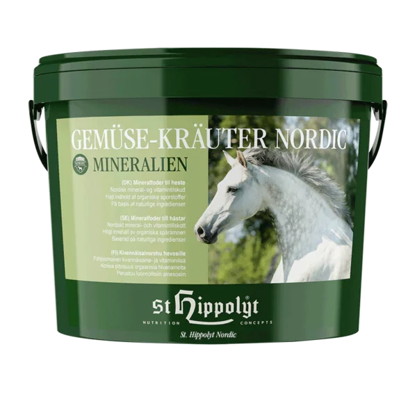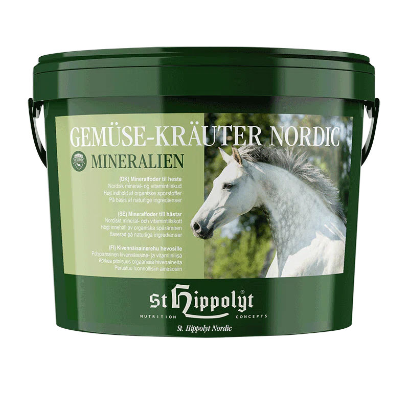 Gemüse-Kräuter-Mineralien Nordic perustuu merilevästä peräisin olevaan luonnonkalkkiin, jolla on korkea biologinen hyötyosuus. Vihannekset, hedelmät ja yrtit tarjoavat tärkeitä toissijaisia kasviaineita, hyvää makua ja hyvän sulavuuden. Tuote sisältää hivenaineita ja vitamiineja biologisesti tehokkaina annoksina ja tarkoin määritellyillä määräsuhteilla. Sokeri- ja tärkkelyspitoisuus on alle 10 %, ja tämän ansiosta tuote soveltuu myös tässä suhteessa herkille hevosille. Ihanteellinen valinta, kun hevosen riittävä kivennäisaineiden ja vitamiinien saanti on varmistettava esimerkiksi liian vähäisen väkirehun tai laidunruohon saannin vuoksi tai kun hevosen tarvitsema määrä on lisääntynyt työkuormituksen, tiineyden tai imetyksen vuoksi. Vitamiinit ja kivennäisaineet ovat mukana kaikkialla aineenvaihdunnassa, ja ne ovat välttämättömiä kehossa tapahtuvan jatkuvan solujen uusiutumisen kannalta.